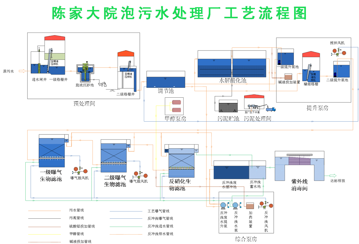 該污水處理廠主體工藝由預處理間、調(diào)節(jié)池、提升泵房、水解酸化池、一級曝氣生物濾池、二級曝氣生物濾池和反硝化生物濾池、紫外線消毒間等構(gòu)筑物組成。其中曝氣生物濾池采用我公司專利技術(shù)“后置反硝化脫氮工藝”。出水水質(zhì)可達到國家《城鎮(zhèn)污水處理廠污染物排放標準》(GB18918-2002)中的一級A類標準。