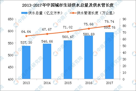 城鎮(zhèn)化水平提升,城市基礎(chǔ)設(shè)施建設(shè)必然要適應(yīng)城市發(fā)展,將推動(dòng)與人們?nèi)粘I钕⑾⑾嚓P(guān)的城市公共供水設(shè)施及其重要環(huán)節(jié)二次供水設(shè)施的建設(shè)。2013年至2017年,我國城鎮(zhèn)化率由53.73%提升至58.52%,相應(yīng)地每年生活供水總量由537.30億立方米增長(zhǎng)至593.76億立方米,供水管道長(zhǎng)度由64.64萬公里增加至79.74萬公里。如果不考慮城鎮(zhèn)供水普及率提升的影響,平均城鎮(zhèn)化率每提升1個(gè)百分點(diǎn),供水管道長(zhǎng)度需要增加2.71萬公里。