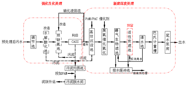 我司于2018年6月與國星生化公司簽訂該污水廠提標改造工程設計采購施工合同,2019年8月完成水質(zhì)調(diào)試驗收工作。改造后處理工藝采用:水解酸化(改造)+CASS工藝(改造)+高效沉淀池(新建)+臭氧催化氧化(新建)+曝氣生物濾池工藝(新建),出水為《城鎮(zhèn)污水處理廠污染物排放標準》(GB18918-2002)一級A標準,其出水利用現(xiàn)狀污水管道進入當涂縣第二污水處理廠。
