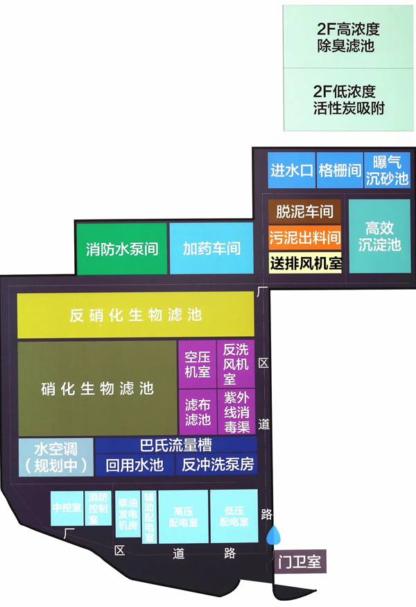 污水廠加蓋封閉除臭,華騏環(huán)保采用了高、低濃度兩套除臭系統(tǒng),高濃度臭氣采用生物濾池除臭,低濃度臭氣采用活性炭吸附除臭,尾氣通過綜合大樓專用排放管道100m高空排放,有效解決了臭氣對(duì)周邊居民的影響,衛(wèi)生防護(hù)距離縮小至零。