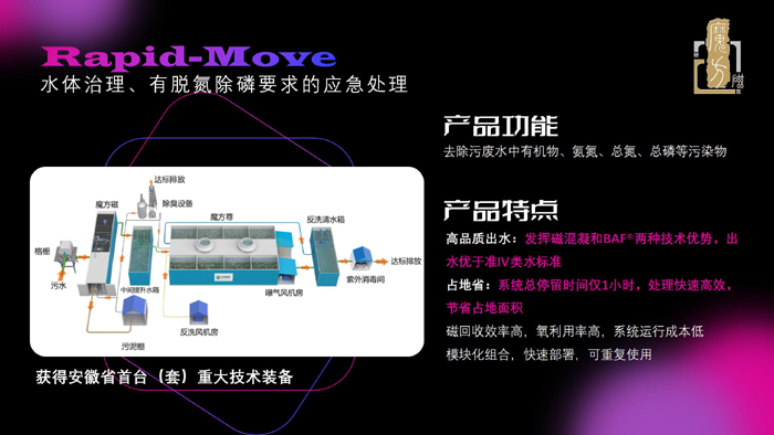 如遇同時(shí)要求脫氮除磷的提質(zhì)增效或應(yīng)急處理項(xiàng)目,可選用由魔方磁和魔方尊組合成的“Rapid-Move”系統(tǒng),該系統(tǒng)曾獲得安徽省首臺(tái)(套)重大技術(shù)裝備,其發(fā)揮了磁混凝和BAF兩種技術(shù)優(yōu)勢(shì)——系統(tǒng)總停留時(shí)間僅1小時(shí),占地面積??;出水水質(zhì)為準(zhǔn)四類標(biāo)準(zhǔn);模塊化組合,快速部署,可重復(fù)利用。