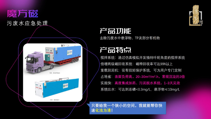 狹小空間亦可快速化濁為清——針對(duì)水體治理,以及污水處理廠、工業(yè)廢水廠應(yīng)急處理場(chǎng)景,要求快速解決污水感官問(wèn)題,以及去除TP的情況下,可以選用魔方智水的魔方磁,其功能是去除SS和TP,它有車載式和集裝箱式兩種形式,采用磁加載混凝澄清技術(shù),表面面負(fù)荷 20 以上、停留時(shí)間是常規(guī)沉淀技術(shù)的 1/3-1/4,占地小,處理效率高。高度集成了加藥、污泥脫水以及控制系統(tǒng),快速部署,快則1天,慢則3天就即可見(jiàn)效,處理效果立竿見(jiàn)影。