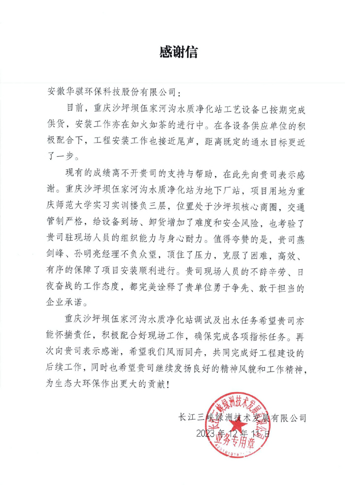 近日,長(zhǎng)江三峽綠洲技術(shù)發(fā)展有限公司向安徽華騏環(huán)保科技股份有限公司發(fā)來(lái)感謝信,對(duì)華騏環(huán)保工作人員在建設(shè)重慶沙坪壩伍家河溝水質(zhì)凈化站項(xiàng)目過(guò)程中,高效、有序的保障了項(xiàng)目順利安裝表示高度贊揚(yáng)與衷心感謝。